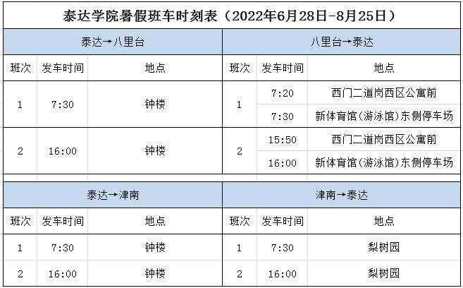 1.泰达与八里台、津南校区通勤班车自2022年6月28日(周二)至8月25日(周四)按照假期班车方案运行,具体班次为: