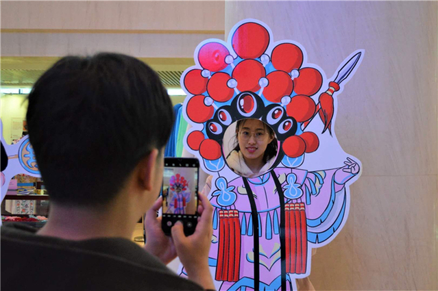 In front of the exhibition board of Peking Opera characters, the visitors took pictures and exchanged experiences.