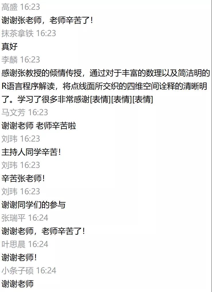 在漫谈部分,张连增以案例为主,对R的运算逻辑进行了讲解与分析,加深了同学们对该软件的认识。他列举“随机点名”“概率函数”“矩阵运算”等贴近课堂教学的例子,配合代码部分的展示,呈现了R的基本应用。同时,张连增详细讲解了R与LaTex、R的绘图等进阶专题,细致剖析代码的意义,对R的应用进行了提高与拓展。同学们纷纷表示受益颇多,在热烈的评论互动中,首期“桃李讲坛”圆满结束。