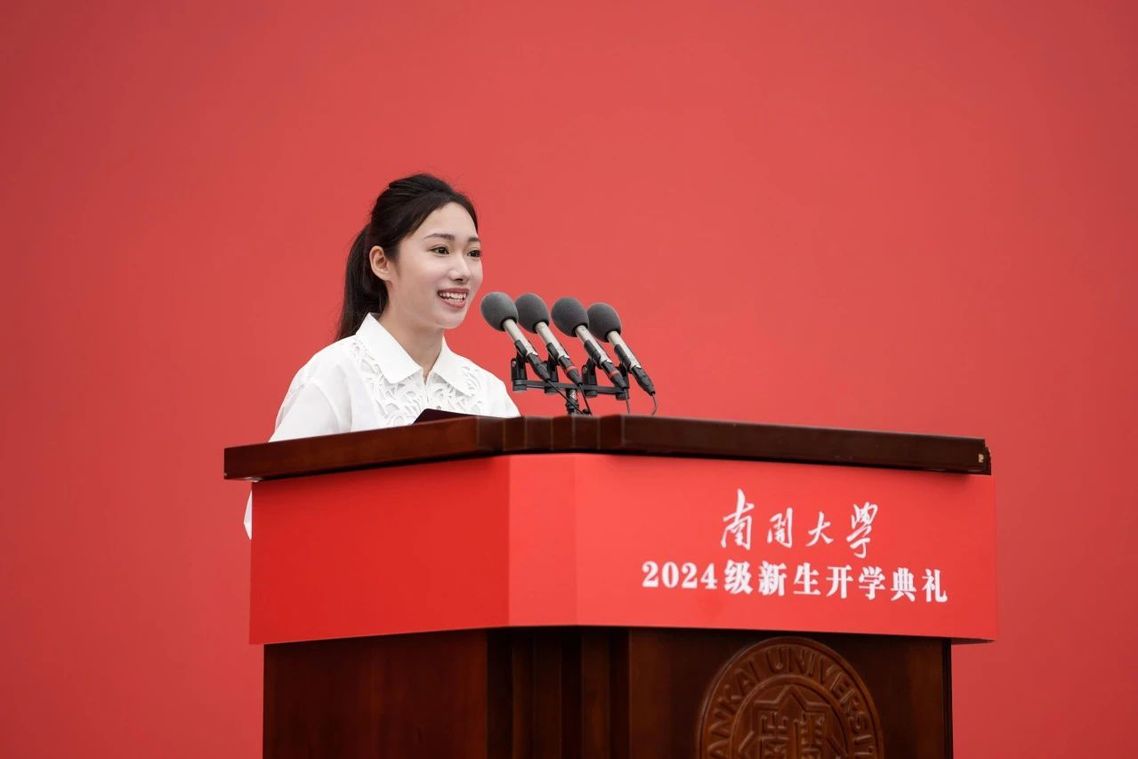 2024年9月8日,南开大学2024级新生开学典礼成功举行。南开大学金融学院2023级博士研究生王晓萌作为在校生代表发言,主题是:做与新时代同向同行、共同奋进的南开青年。