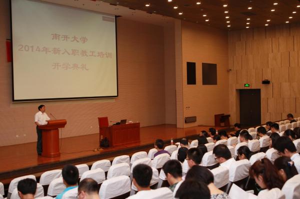 南开新闻网讯(记者 乔仁铭 摄影 任永华)7月14日,南开大学2014年新入职教工培训开学典礼举行。副校长佟家栋出席,并为新教工作了题为“高等学校教师的追求与责任”的报告。