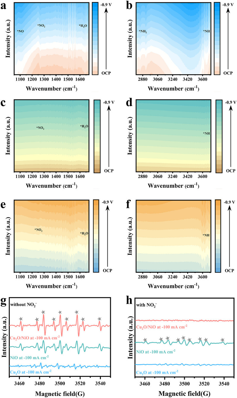 图5. a,b)Cu2O/NiO,c,d)Cu2O,e,f)NiO在OCP至-0.9 V时的电位依赖性原位FTIR光谱。DMPO参与了Cu2O/NiO、Cu2O和NiO的原位EPR光谱(g)不含NO2-和h)含NO2-。在-80 mA cm-2电解10分钟后收集每条线。