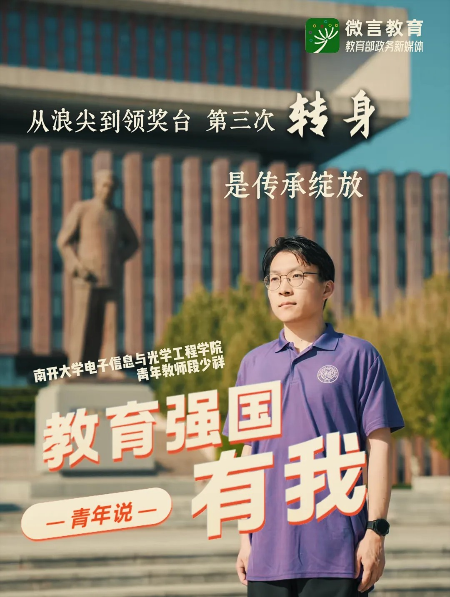 习近平总书记强调,全面推进强国建设、民族复兴伟业,正是年轻一代展示才华、大显身手的好时候。教育强国建设,青年何为?五四青年节之际,教育部政务新媒体启动“教育强国,有我!”网络主题宣传活动,推出“青年说(奋进篇)”系列,展现青年师生以青春之我、奋斗之我投身教育强国建设的生动实践。今天,跟教育小微通过1个微视频和1组海报,来看南开大学新青年用三次“转身”写下的青春答案——