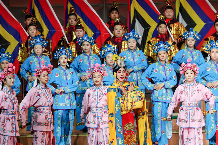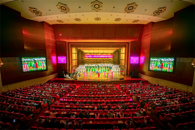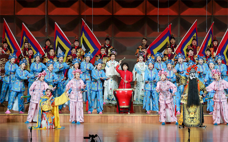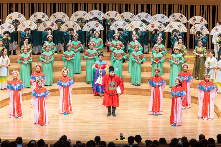 两场演出的最后一支曲目是合唱团永不褪色的冠军曲目《盛世梨园情》。水袖翻飞、唱腔婉转,指挥的刀马旦装扮飒爽亮相,歌声将生旦净丑4种行当、唱念做打4种基本功表现得大气磅礴,一方舞台传承经典,尽显京剧的绝代芳华。