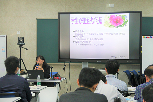 学生心理健康指导中心主任袁辛教授作题为“学生心理压力解析与应对”的专题辅导报告,对当前大学生心理状况进行总体分析,阐释了多发问题类型。袁辛教授讲到,作为高校教师,要学会尊重学生、理解学生、关注学生,并在沟通中形成融洽的师生关系。