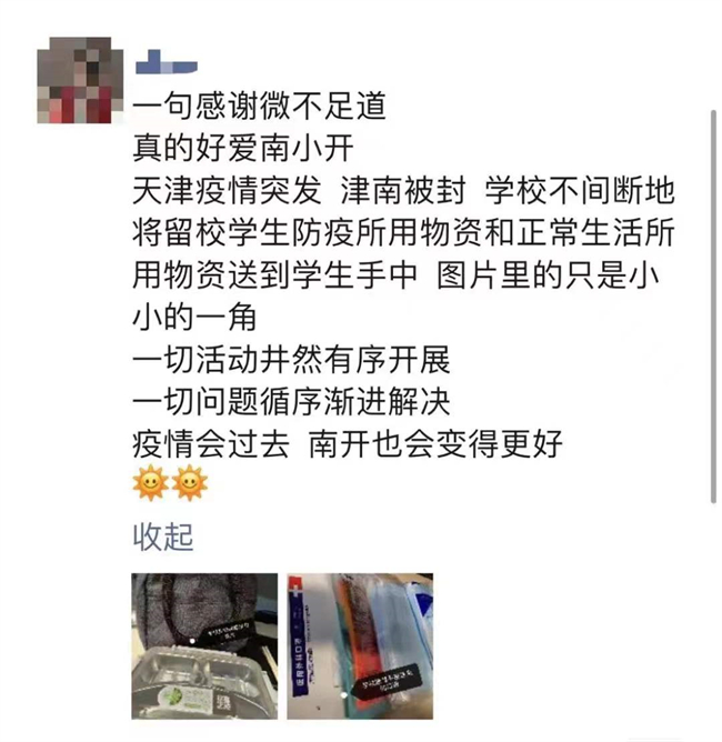 根据疫情防控要求,自1月13日起,南开大学津南校区学生食堂、餐饮商户取消堂食。为配合上述疫情管控措施,综合考虑疫情防控政策、校园生态文明等因素,校疫情防控领导小组决定,由后勤服务处牵头购置饭盒套装,配发给每一位滞留人员(师生员工和有需求的服务外包人员)。