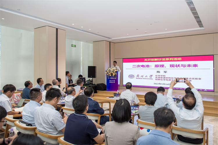 南开新闻网讯(通讯员 李海霞)9月24日,“高安全、高比能二次电池”创新沙龙,在天开高教科创园成功举办。天津市政协副主席李剑萍出席活动并讲话。中国科学院院士、天津市科协副主席、南开大学副校长陈军教授围绕“二次电池:原理、现状与未来”作主旨报告。国家杰出青年基金获得者、南开大学教授程方益,国家杰出青年基金获得者、清华大学深圳国际研究生院长聘副教授贺艳兵,国家级青年人才、天津大学教授杨春鹏作专题报告。天津市有关部门负责同志以及来自全市有关高等院校、科研院所、重点实验室、投融资平台、重点企业等80余名专家、学者、技术经理人、企业家、在校研究生参加活动。