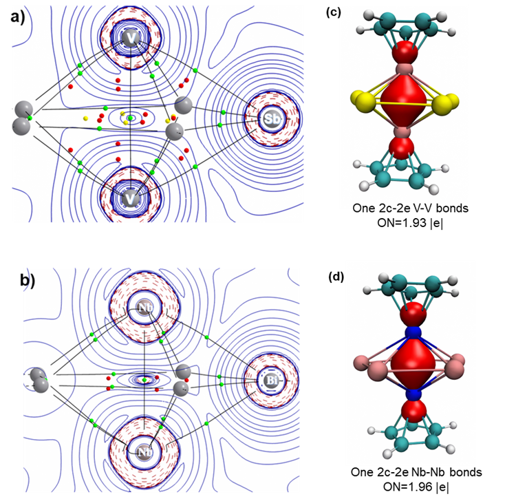 图3. [V2Cp2Sb5]2-和[Nb2Cp2Bi5]2-的QTAIM以及AdNDP分析