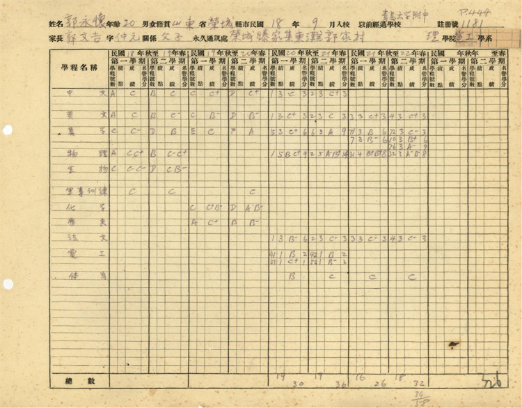 图3 郭永怀在南开大学成绩单(南开大学馆藏档案)
