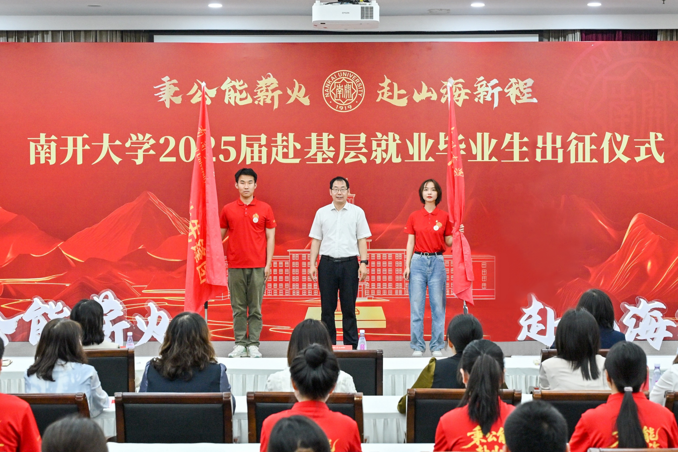 南开新闻网讯(通讯员 梁金)5月26日,南开大学举办2025届赴基层就业毕业生出征仪式暨第八期“焦桐计划”开班式。校党委副书记牛文利出席活动,党委学生工作部、校友工作办公室负责人,各学院分管就业工作负责人和辅导员,基层就业校友代表及2025届毕业生代表等130余人参加。活动以“秉公能薪火・赴山海新程”为主题,为新一代南开人奔赴基层赋能启航。