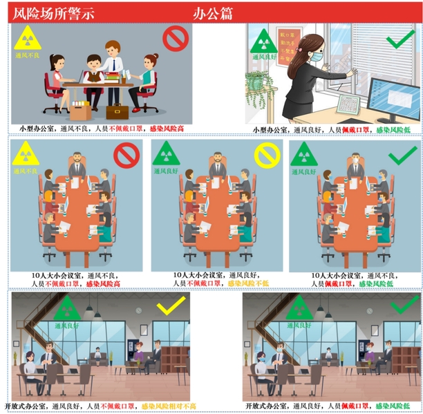 新冠病毒场所传播风险示意图 (基于情景模拟研究)