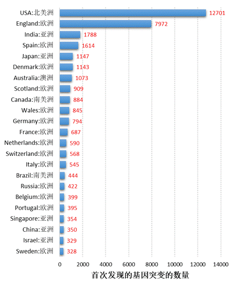 通过对所有基因突变首次出现的国家(地区)进行统计和分析,发现大部分新发的突变都是发生在疫情未受到充分重视的地区和国家。这些国家松懈的防疫政策导致了病毒的广泛传播,新基因突变随之发生,且数量增加。在新冠病毒4万多个基因突变中,有2万多个新突变是在美国和英国的毒株中首次出现的。这也许是N501Y病毒株在英国传播开来的原因之一。(图4