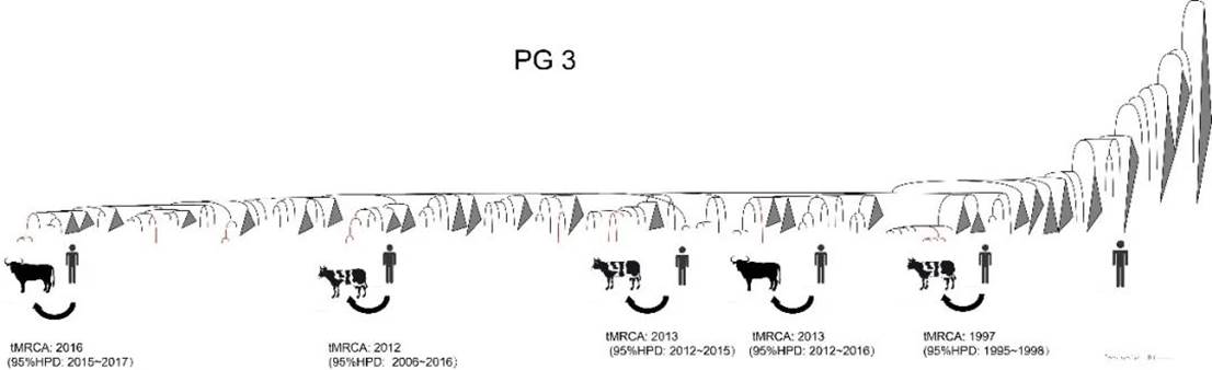 PG1种群的最早显现的时间大约为1660年左右,PG3种群的最早显现时间大约为1848年左右。在PG1PG3菌株的系统发生树上,人类菌株处于祖先的位置,充分提示是人把志贺菌传给牛的。采用 BEAST 软件对不同宿主种群进行系统发育分析和分化时间估计,结果显示PG1动物菌株可分为4个谱系,显现时间估计在1948-1966年之间;PG3菌株可分为8个谱系,显现的时间估计为1997-2016年(图2,图3)。也就是说,人类把志贺菌传给牛的时间大约在上述年代,且发生了多次。在志贺菌从人传给牛后,福氏志贺氏菌种群进化速率有显著差异,进化速率减慢。