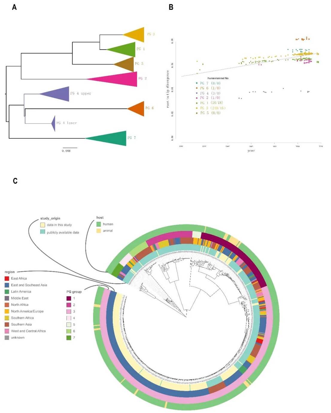 徐建国院士团队和中国医学科学院苏州系统医学研究所、北京师范大学、澳大利亚新南威尔士大学和河北工程大学等多个团队合作,对从牦牛奶牛肉牛分离34株动物菌株,和19502017年间从17个省市患者分离的268株进行了基因组测序,结合全球公共数据库的346株福氏志贺氏菌基因组序列,一起进行系统发生学分析。研究发现,可把这648株福氏志贺菌分为7PG (1)34株动物志贺菌可分为2个群,PG1PG3,分别占52.94%18/34)和 47.06%16/34)。从系统发生学信息看,PG1群菌株显现时间早,主要为牦牛分离株;PG3菌株显现时间晚,主要为肉牛和奶牛分离株。中国患者菌群主要是PG3群,占91.54%249/272)。在毒力质粒、抗菌素耐药基因等方面,PG1PG3菌株具有明显的差异。PG3动物分离株与近年来在中国人群中的流行株相似,均为ST91型,具有多重耐药特点,部分属于近年新出现的Xv血清型。